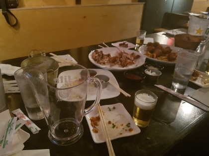 ces 2017 d01 04 Figure 4. 이조곰탕에서의 거한 점심 이조곰탕, 베가스에서 나름 잘하는 집이다. 벌써 주차장은 가득 차고 웨이팅 종이는 모두 써서 더 적을 공간이 없었다. Y가 함께한 일행 보다 먼저 온 일행이 있다. 얘기하는 폼새가 삼성전자 직원 같았다. 그걸 모르고 늦게 온 K가 담배를 태우며 작년 CES와 올해 CES를 예상하며 올해도 LG가 이길 것 같다는 이야기를 한다. 이내 대기하는 사람들이 삼성 직원이라는 것을 알고는 조용해졌다. K의 팀이 늦게 왔지만 삼성 일행은 인원이 훨씬 많아 K팀 일행이 먼저 들어간다. 도가니 셋, 살코기 하나, 섞어 하나를 시킨다. 불고기 안주에 소맥으로 낮술이 시작된다. 그렇게 거하게 먹고는 에어비밴비로 예약한 집으로 이동했다.