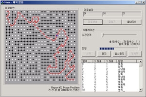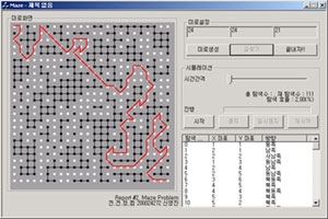 미로 생성 버튼을 누르면, 입력한 정보에 맞게 미로가 생성 됩니다. 그런 다음 길찾기 버튼을 누르게 되면, 쥐돌이가 열심히 미로를 찾게 됩니다. 미로를 찾은 경우는 왼쪽 화면과 같이 붉은 색으로 자신이 찾은 경로를 출력해 줍니다. 중간에 삽질한 부분에 대한 이동 경로는 출력하지 않습니다.