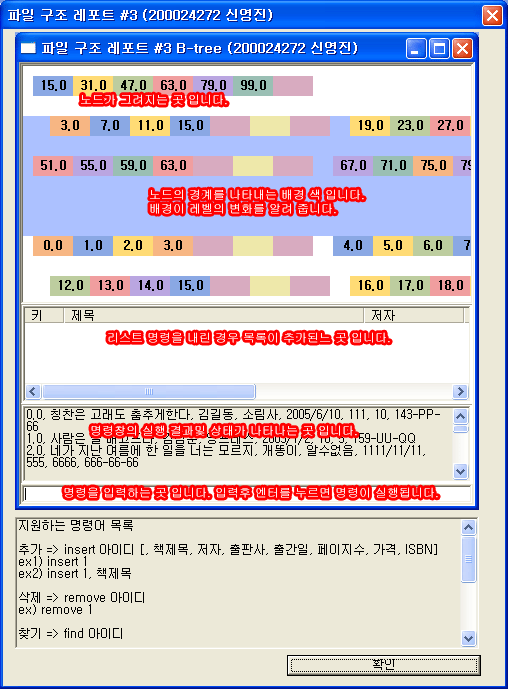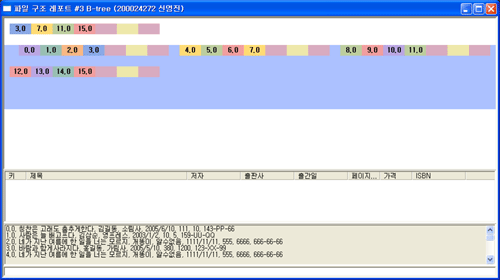 실제 프로그램 화면... BTree를 좀 더 멋있게 그리고 싶었으나... 시간의 압박으로 ㅋㅋ- 물론 이 프로그램의 노드는 3레벨 이상이 되면 어떻게 될지 모른다. 게다가 스크롤바도 없다... ㅋㅋㅋ~