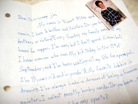 중학교를 진학하고 얼마되지 않아서 난 영어를 배우기 시작했다. 그러다 우연히 책장 깊숙히 꽃혀있는 보이스카웃 잡지에서 국제 펜팔이란 것이 있음을 알게 되었다. 그래 이거다. 난 생각했다. 서점으로 가서 영어 편지에 관한 책을 한권 샀다. 그리곤 먼지가 수북히 쌓여있는 잡지에서 여자 이름을 집어서 편지를 보냈다. 이게 그 때 받은 답장이다. 난 분명히 다른 여자이름한테 보냈는데 Robert한테 답장이 왔다. 아마도 그 여자애의 사촌이 저 아인 것 같다. 그 당시 굉장히 실망스러웠다~ 나의 첫 펜팔 대상이 남자라뉘... ㅠ.ㅜ~ 그 후로 두 세번 정도 더 교환하고 끊었던 것 같다.
