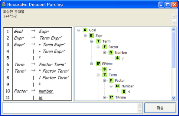 왼쪽 그림에 있는 문자열을 파싱해서 트리로 구성해서 보여줍니다.