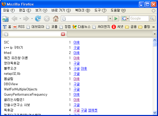태터툴즈 레퍼러 로그 테이블의 url을 추출해서 검색어를 찾아주는 역할을 합니다. 급조한 거라 버그도 많고, 기능도 미비합니다. ㅎㅎ- 거의 암호 수준이죵... 필요하신 분들은 들고가서 사용해 보세용~ qs() 함수 부분의 디비 정보만 수정해주시면 됩니다. 그리고 호스팅에서 파이썬을 지원하고 MySQLdb같은 거도 설치되어 있어야 합니당. 실행하면 위의 화면처럼 나옵니다.