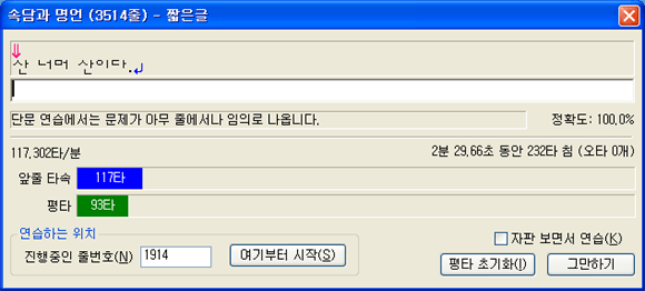 세벌식 연습하기... @codemaru · December 13, 2006 · 0 min read 2006y 이틀전부터 세벌식 연습을 하고있습니다. 맘처럼 쉽게늘지 않네요. 덕분에 타자가 느리신 분들의 고충을 이해할 것 같습니다. 한 십년만에 해보는 타자 연습이네요. ㅋㅋㅋPrevious Post프로그래머와 들여쓰기...Next Post후킹 11월호 연재 패치@codemaru돌아보니 좋은 날도 있었고, 나쁜 날도 있었다. 그런 나의 모든 소소한 일상과 배움을 기록한다. 여기에 기록된 모든 내용은 한 개인의 관점이고 의견이다. 내가 속한 조직과는 1도 상관이 없다.