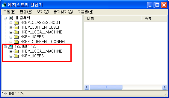 그러면 레지스트리 편집기에 접속한 IP의 레지스트리 구조가 표시됩니다. 해당 레지스트리를 수정하시면 컴퓨터를 사용할 수 있습니다.