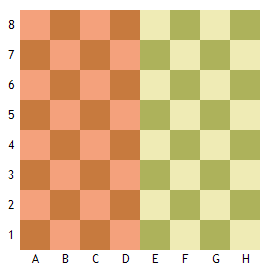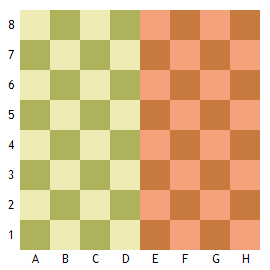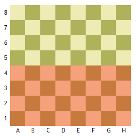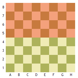 시작시 흑이 위치한 위쪽 네 개의 랭크를 흑 진영(black squares), 아래쪽 네 개의 랭크를 백 진영(white squares)라고 합니다. 왼쪽 그림이 흑 진영, 오른쪽 그림이 백 진영 입니다.