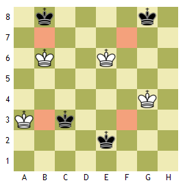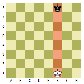 대립이란 체스의 왕이 서로 홀수 칸을 남겨둔 상태로 위치한 것을 말합니다. 왼쪽 그림의 경우 직접적인 대립을 보여줍니다. 붉은 색 칸이 중요한 영역이 됩니다. 왼쪽 그림과 같은 상황에서 왕이 서로 피할 수 없이 공격만 해야 한다면 누가 이길까요? 당연히 나중에 두는 사람이 이깁니다.