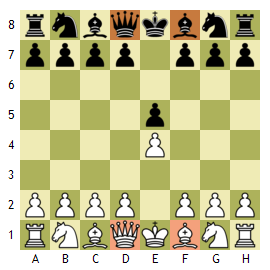 오픈 게임이란 그림의 왼쪽과 같이 시작하는 게임을 말합니다. e4, e5로 시작되는 게임이죠. 이 게임의 특징은 킹 폰을 전진 시킴으로써 비숍과 퀸의 길이 열린다는 점 입니다. 또한 킹폰으로 중앙에 대한 영향력을 행사하게 됩니다. 흑 또한 대칭적인 위치의 e5를 전진 시킴으로써 동일한 장점을 얻게 됩니다.
