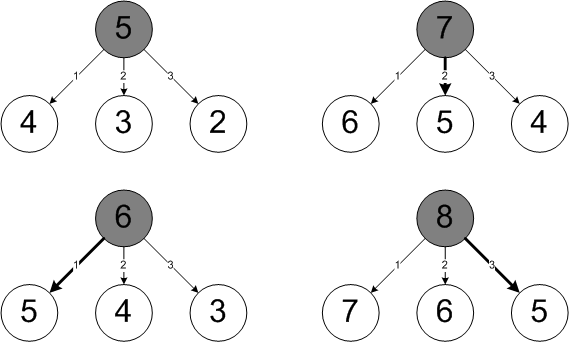 좀 더 복잡한 상황을 생각해 보자. 5개, 6개, 7개, 8개가 테이블에 남은 상황에 대한 결정 트리가 <그림 2>에 나와있다. 5개 남은 경우엔 이길 수 있는 방법이 없고, 6개 남은 경우엔 하나를 가져감으로써 이길 수 있다. 나머지 경우에 대해서도 곰곰 생각해 보자.