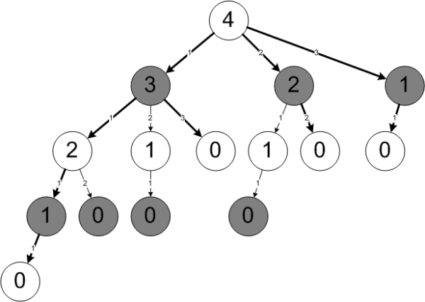 트리를 보는 방법은 간단하다. 루트에 있는 4는 현재 동전이 네 개 남아있음을 나타낸다. 자식으로 3, 2, 1이 있는 것을 볼 수 있다. 각각은 우리가 한 개, 두 개, 세 개의 동전을 가져간 경우에 테이블에 남게 될 동전의 개수다. 각각의 상황에서 상대방이 선택할 수 있는 모든 경우가 그 노드의 자식으로 있다. 예를 들면, 3개가 남은 상황에서는 상대방의 선택에 따라 테이블에 동전이 두 개, 한 개, 내지는 없을 수 있는 것이다.