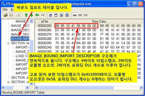 그렇다면 바인드 정보를 포함하고 있는 notepad.exe를 한번 분석해 보도록 합시다. 윈도우에 포함된 기본 노트패드 입니다. 우선 바인드된 PE 포맷은 섹션 헤더 이후에 BOUND_IMOPRT_TABLE(이하 BIT)이라는 놈이 따라 나옵니다. 이 놈의 위치는 NT헤더 OptionalHeader에 있는 DataDirectory에서 IMAGE_DIRECTORY_ENTRY_ BOUND_IMPORT를 따라 가면 됩니다. PE Viewer로 슈욱 따라가보면 아래와 같은 화면이 나옵니다.