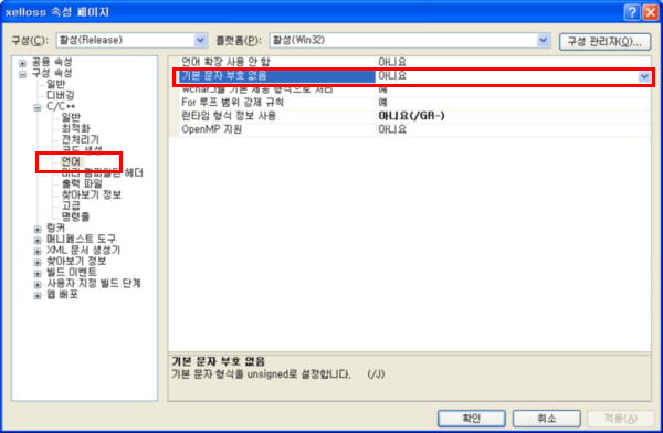 언어탭의 기본 문자 부호 없음 속성이 있더군요. 부호 없음이란 말에 익숙치가 않아서 못찾았나 봅니다. 잘못된 정보였네요. 여기서 예를 하면 /J 옵션이 자동으로 추가됩니다. 굳이 수동으로 추가하실 필요 없습니다.