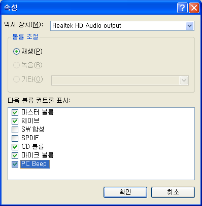 이건 PC 스피커 선을 사운드 카드 출력에 연결해둔 노트북에서만 통하는 방법입니다. 볼륨 조절을 열고, 옵션에서 속성 메뉴를 선택합니다. 그럼 아래 화면처럼 속성 창이 나타납니다. 거기에 보시면 PC Beep라는게 있습니다. 체크를 하고 확인을 누릅니다.