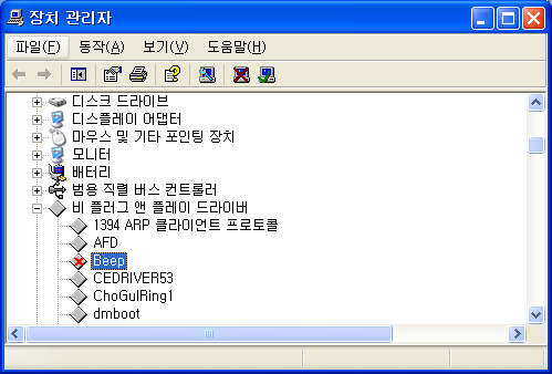 모르면 찾으라고 인터넷 항해를 시작했다. 여기저기에 PC 스피커 연결 단자를 제거하라는 말 뿐이었다. 노트북을 열어서 그 짓을 할 수도 없는 노릇이었다. 그러던 와중에 마지막 댓글에 한 줄기 광명의 빛이 보였다. 장치 관리자에서 보기 메뉴에서 숨김 장치 표시를 선택한 다음 나오는 Beep를 사용안함으로 하면된다는 글이었다. 숨김 장치를 표시하도록 만들면 아래와 갈은 화면이 뜬다.
