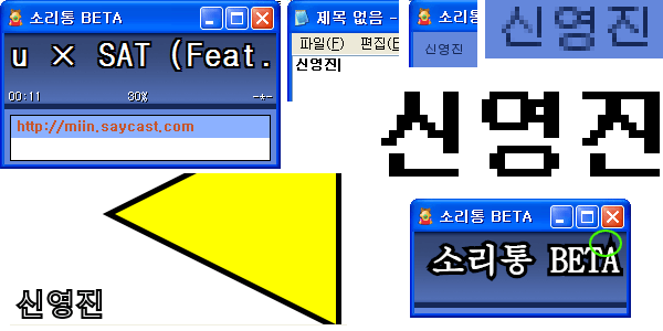 왼쪽 아래 있는 노란색 삼각형과 신영진이란 테두리가 있는 글씨가 GDI+대신 사용한 agg란 2d 렌더링 엔진으로 출력한 샘플 입니다. 여기까진 굉장히 만족스러웠습니다. 보시면 알겠지만 삼각형의 라인이 겹치는 부분이나 대각선에 안티알리아싱이 적용된 것을 보시면 깔끔하게 처리된 것을 알 수 있습니다. 외곽선 글꼴도 그냥 저냥 쓸 수 있겠다고 생각하고는 이 녀석을 소리통에 적용하기 시작했습니다. 그런데 이 판단엔 큰 실수 였습니다. 하나는 큰 글씨로 테스트 했다는 것이고, 다른 하나는 그 글꼴도 맑은 고딕으로 테스트를 했다는 점 입니다. 다들 아시겠지만 맑은 고딕은 클리어타입과 같은 안티알리아싱 기술에 최적화된 글꼴 입니다. 클리어타입을 적용하지 않고 보면 완전 엉망이죠. 하지만 적용하면 글꼴의 차원이 달라집니다.