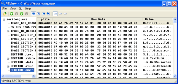 }Matilda1에 감염되면 파일의 끝에 .vmat 섹션이 추가되고 엔트리 포인트가 바이러스 코드로 변경됩니다. 따라서 휴리스틱 기능을 사용하는 백신 엔진에는 바로 걸리겠죠. 결국 마소 12월호 광고 였습니다.