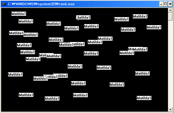 어떤 바이러스인지 궁금하시죠? 감염된 파일을 실행하면 아래 화면처럼 마우스 포인터가 위치한 곳에 Matilda1이란 글자를 마구 씁니다. 증상은 그게 답니다. 프로그램 종료할 때까지 열심히 쓰죠. 증상은 그게 전부입니다. 뭔가 그럴싸한 증상을 만들고 싶었으나 마땅한게 없더군요. 근사한건 너무 길어서 ㅋㅋ
