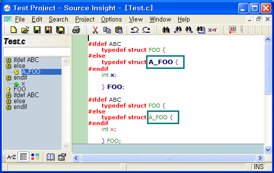 문제를 단순화 시키면 위와 같습니다. 똑같은 두 문장이 반복되서 나오는데 첫 번째 A_FOO를 보면 진하게 표시된게 소스 인사이트가 알아 먹었음을 알 수있습니다. 그런데 두 번째 A_FOO를 보면 연하게 표시된게 소스 인사이트가 알아먹지 못했음을 알 수 있습니다. 헐헐. 뭔가 파서의 문제라는게 확 느껴지지 않나요. 삽질한게 아까워서 감히 염치도 없이 소스 인사이트 서포트 메일에 버그인 것 같다고 메일을 보냈습니다. 그리고는 Visual Studio를 꺼내서 ddkbuild로 작업했습니다. 소스 인사이트 뽀대가 좀 아쉽긴 했습니다. ㅋ