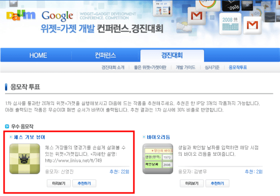 얼마 전에 아는 형 소개로 다음-구글 가젯 공모전에 출품을 하게 되었습니당.