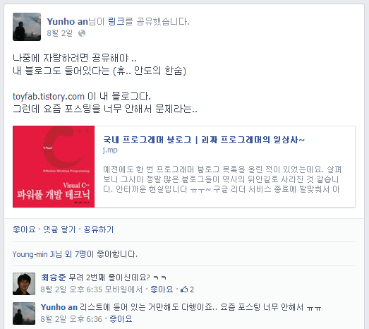 그랬던 꼬꼬마 프로그래머인 저도 마소에 소소한 글을 쓰면서 언젠가 한번은 안윤호님에 대해서 물었던 기억이 있습니다. 그.런.데. 놀라운 일이 몇일전 제가 “국내 프로그래머 블로그”란 글을 올리고 벌어지게 되었습니다 ㅋㅋㅋ~ 바로 존경해 마지않는 안윤호님과 페친이 된 것입니다. 사실 전 뭐 페북을 별로 안 해서 페친된 걸 자랑질 하는 건 아니구요. 어린 시절 저의 우상이었던 분께 제가 발견되었다는 기쁨을 좀 자랑질하고 싶었습니다 ㅋㅋㅋ~