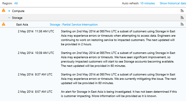 덧) 8시간만에 장애는 해결됐다. 그러고도 안 살아나서 초큼 당황했는데 침착하게 파워쉘로 강제 종료하고 켜니 잘 켜졌다. 서버가 다시 살아나서 천.만.다.행… 그래도 매 시간 서비스 상태를 알려주는 페이지를 통해서 작업 진행 상황을 알려줘서 덜 당황할 수 있었다. 역시MS. 우리가 손가락만 빨면서 침묵한건 함정 ㅠㅜ~