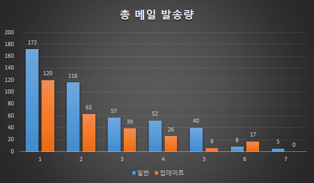 7명의 직원이 근 한달간 메일 업무를 한 내용을 정리한 그래프다. 일반이라고 표시된 것은 업데이트가 아닌 일반 메일로 주로 업체에서 특정 사항에 대한 문의나 요청을 한 것에 대한 회신의 회수를 의미하고, 업데이트는 우리 제품의 새로운 업데이트 안내 메일을 발송한 회수를 표시한 것이다. 그러니 일반은 약간 (업체에 의해서 강제된) 비자발적 메일, 업데이트는 자발적 메일 발송이라고 볼 수 있다. 물론 업데이트 또한 요청에 의해서 발송되는 경우도 있기 때문에 100% 자발적 메일 발송이라고 보기에는 무리가 있다.