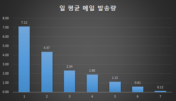 위 그래프는 해당 기간 동안에 하루 평균 몇 통의 메일을 보냈는지를 나타내는 그래프다. 1번 직원의 고충이 좀 더 선명하게 드러나는데 나머지 직원과의 비교는 둘째 치더라도 이 직원이 하루 평균 7통의 메일을 보낸다는 사실에서 심각한 격무에 시달리고 있음을 알 수 있다. 8시간 근무라고 가정했을 때 통상적으로 한 시간에 한 통의 메일을 보냈다는 점이다. 업무 일수가 아닌 단순 기간으로 나눈 통계이기 때문에 업무 일수로 나눈다면 그 정도가 훨씬 심해질 것이다. 실제로 1번 직원은 “요즘 정말 정신없이 바빠서 뭔가 다른 걸 생각할 엄두가 나지 않는다”라는 이야기를 했다. 그말이 그저 하는 엄살은 아니라는 걸 보여주는 그래프인 것 같아 더 씁쓸하다.