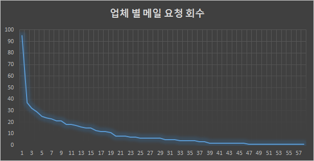 상황을 좀 더 세밀하게 이해하기 위해서는 결과만 바라볼 것이 아닌 원인도 같이 고려해야 한다. 그런 이면을 보여주는 것이 이 그래프다. 그래프는 지난 한달간 우리에게 적어도 1회 이상 요청 메일을 보낸 업체를 보여주고 있다. 60여개 정도의 업체에서 1통 이상의 요청이나 문의 메일을 보냈는데 살펴보면 데이터가 좀 재미있다. 바로 요청의 대부분을 자주 요청하는 업체에서 거의 독식하고 있다는 점이다. 특히나 1위를 기록한 업체는 근 100여번의 요청을 했는데, 전체에서 차지하는 비중이 무려 16%에 이른다. 당연한 이야기겠지만 그 업체 담당자가 1번 직원이다. 이 업체는 일 평균 2.43통의 요청 메일을 보냈는데, 내가 생각하기에 거기에 병목 지점이 있다. 즉, 그 업체가 지속적으로 뭔가를 요청하는 메일을 보낸다는 것은 상황이 좋지 않다는 것을 의미하기 때문이다. 우리에게 요청을하지 않아도 문제를 해결할 수 있도록 개선된다면 100통의 메일을 처리할 필요가 없어진다는 점이다. 그리고 실제로 그 업체에서 요청하는 상당수 메일을 살펴보면 개선할 여지가 있는 요청 메일이다.