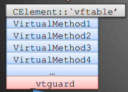 VTGuard의 원리는 간단하다. 가상 함수 테이블 끝에 추가적인 필드를 붙여서 중간의 함수 메소드 값이 변경되었는지 검사하는 방식이다. [그림 1]에 나와 있는 것과 같이 테이블 끝에 vtguard에 해당하는 값을 넣어서 중간에 값이 변경되었는지 검사할 수 있다. vtguard에 VirtualMethod1, 2, 3, 4, …의 CRC 값이 담겨 있다면 앞선 가상 함수들이 호출될 때 테이블의 무결성을 검증할 수 있다. 물론 그 검증하는 코드는 모든 가상 함수의 앞쪽에 붙어 있어야 할 것이다. 물론 이 VTGuard라는 기법 자체도 가상 함수 변조를 완전히 막는 솔루션은 아니다. 왜냐하면 해커가 가상 함수의 값을 변경하고, 그에 맞춰서 vtguard의 값도 업데이트 한다면 우회할 수 있기 때문이다. 서두에 언급한 것과 같이 가상 함수 변조를 조금 더 어렵게 만드는 취약점 완화 방안이라고 생각하면 될 것 같다.