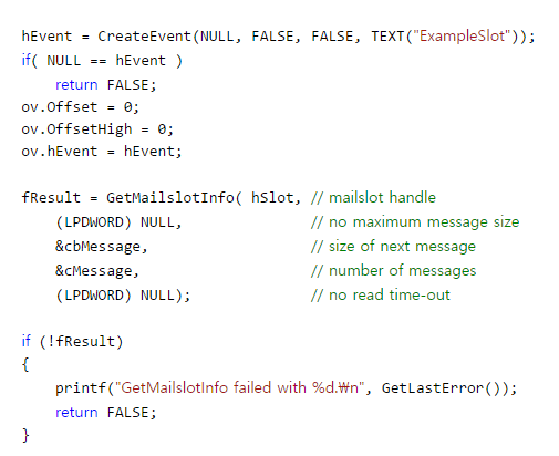 간만에 해킹툴을 하나 살펴보고 있었습니다. 특징적인 게 메일슬롯을 사용하는데 ExampleSlot이란 이벤트 핸들릭이 있었습니다. ExampleSlot이라고 네임드 이벤트 이름을 지은 것도 웃긴데, 핸들릭도 어처구니 없는 그런 해킹툴이었죠. 메일슬롯으로 아주 중요한 데이터가 오가는 것 같아서 관련 함수를 살펴보고 있었습니다. 그러다 이 모든 시츄에이션을 설명해주는 MSDN 예제를 만나게 되었습니다. 그제서야 해커가 왜 그런 ㅂㅅ같은 짓을 했는지 자연스럽게 이해가 되더군요. MSDN 예제를 그대로 복사, 붙여넣기 했는데 그 예제에 핸들릭이 있었던 것이죠. 아무 생각없이 사용하다 벌어지는 정말 웃픈 상황이었습니다.