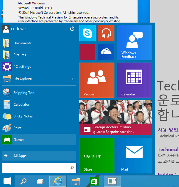 MS 말이 사실인지 확인하기 위해서 저도 테크니컬 프리뷰를 설치해 보았습니다. 윈도 10을 먼저 경험해 보고 싶으신 분들은 여기에서 다운받아 설치해 보시면 되겠습니다. 일단 설치하고 가장 눈에 띄는 건 시작 버튼이 돌아온 거네요. 저에겐 크게 필요하진 않았던 부분이지만 인상적이긴 한 것 같습니다.