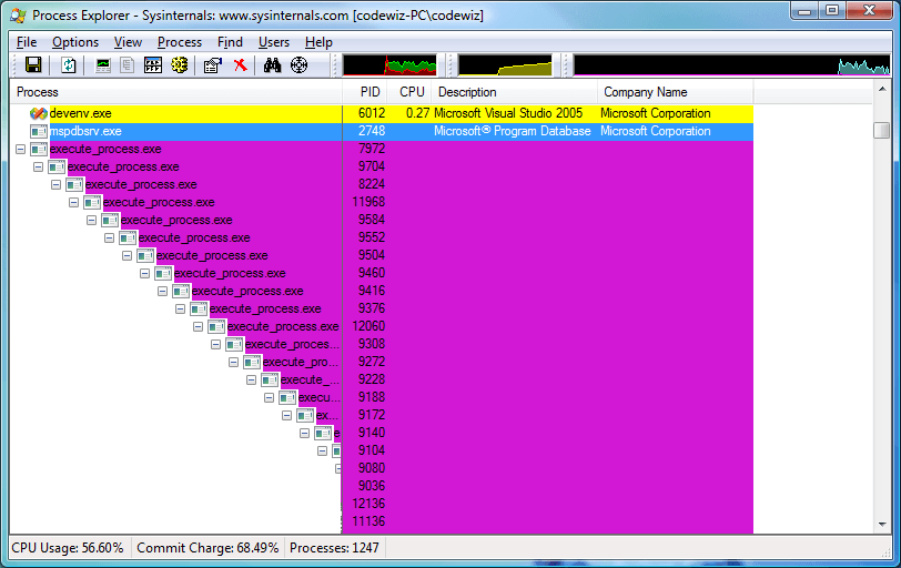}예제 코드를 타이핑해서 실행 시켰는데 “아직 실행 중 입니다.” 요 메시지도 나오지 않고, 프로그램도 끝이 안나더군요. 그래서 소스를 봤더니 sei.lpParameters = _T(“dummy”); 이 줄이 빠져 있는게 아니겠습니까. 즉, 무한대로 계속 프로세스를 생성하고 죽지 않는 그놈을 기다리는 말 그대로 운영체제의 프로세스 생성 능력을 테스트하는 프로그램이 되고 말았습니다. 최후의 자식놈을 죽여야 되는데 밑에 부분에서는 프로세스 생성 제한에 걸려서 계속 프로세스가 생겼다 죽었다를 반복하더군요. 결국 루트를 찾아서 죽이는 것은 실패하고, 로그 아웃을 했습니다. 아래는 그 때 제 PC 상황입니다.