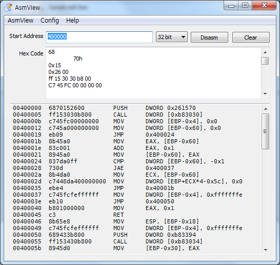 직업 특성상 어셈 코드 볼 일이 많습니다. 직접 실행 파일을 분석하는 경우도 있지만 알 수 없는 곳에서 긁혀온 바이트 코드들을 분석하기도 하는데요. 매번 그런 걸 분석할 때마다 수동으로 하다가 불편해서 하나 만들어 봤습니다. 헥사 코드를 넣으면 디스어셈블된 코드를 보여주는 유틸리티입니다.