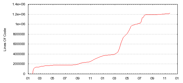 LOC 그래프입니다. 뭔가 좀 경이롭지 않나요? 도대체 5-8월에 무슨 일이 있었던 걸까요? 사실 저 시기가 거의 죽음의 시기이긴 했습니다. 진짜 밥만먹고 코딩했던 것 같네요. 밥도 안먹고 코딩했었나? ㅋㅋ 그래도 거품이 좀 심하죠. 사실 저 기간에 늘어난 LOC 중에 거의 대부분은 IP 지역을 저장하고 있는 SQL 파일이 주범입니다. 500k나 되더군요. 헐. 네 맞습니다. 전체 LOC 거의 절반이 그겁니다. 그래도 이전 버전에서 가져온 코드가 180k 정도니 그 사이에 정말 많이 늘긴 했네요.