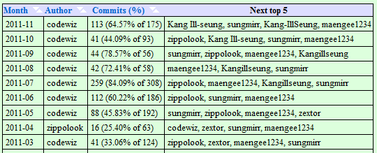 어제는 또 사고를 쳤습니다. 뭐냐구요? 버그죠 ㅋㅋ~ 반성하는 마음으로 디버깅을 밤새 하고는 이전 글에 적었던 충돌 문제도 해결했습니다. QA팀이 출근할 때에 맞춰서 따끈따끈한 빌드를 만들어 놔야겠다는 생각에 빌드를 돌려 놓고는 기다리다 심심해서 간만에 저장소 통계를 돌려 봤습니다. 예전에는 재미삼아 한 달마다 돌려서 개발팀끼리 업적 놀이도 하곤 했었는데 말이죠… ㅋㅋ~ 먹고 사는게 바쁘다보니 그런 것도 해본지가 한 백만년은 된 듯 하네욤. 절대로 우리 회사는 이런 걸로 개발자를 압박하거나 그러진 않습니다. ㅋㅋㅋ~ 여튼 랭킹 한 번 볼까요?
