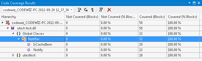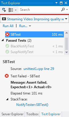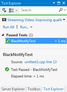 }코드 추가가 끝났으면 각 프로젝트를 빌드하고 Visual Studio 2012 메뉴에서 Test, Window, Test Explorer 항목을 선택한다. 그러면 <화면 5>에 나타난 것과 같이 테스트 익스플로러가 화면에 표시된다. 우리가 앞으로 진행할 단위 테스트와 코드 커버리지는 모두 이 창을 통해서 손쉽게 제어할 수 있다. BlackNotifyTest를 수행하기 위해서는 해당 테스트 이름에서 오른쪽을 클릭한 다음 메뉴에서 “Run Selected Tests” 항목을 선택하면 된다. 그러면 Visual Studio가 알아서 테스트를 진행한 다음 결과를 우리에게 알려준다.