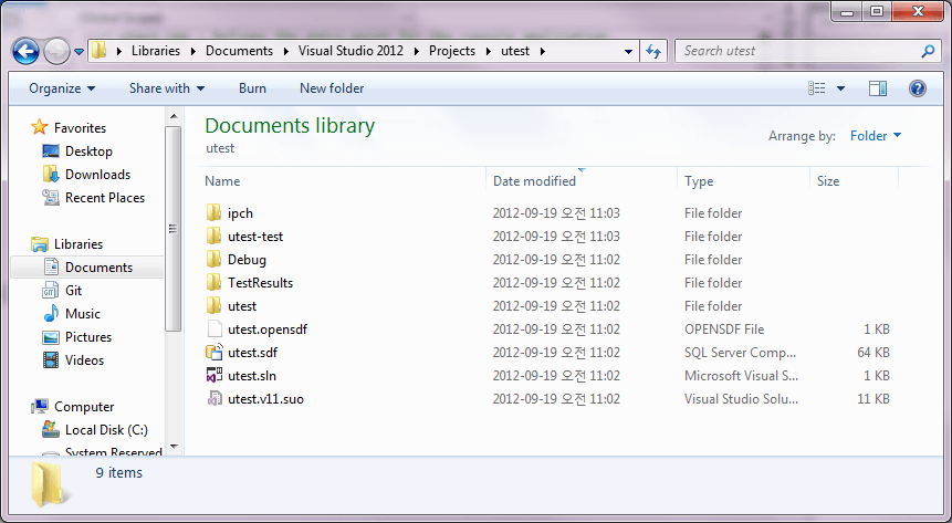 }그럼 이제 프로젝트 구성을 해보도록 하자. Visual Studio 2012에서 utest라는 콘솔 프로젝트를 솔루션 구조로 생성한다. 프로젝트를 생성했으면 이 솔루션에 utest-test라는 네이티브 단위 테스트 프로젝트를 추가하자. 이 프로젝트 타입은 <화면 2>에 나타난 것과 같이 Test 탭에 포함돼 있다. 프로젝트 생성이 끝나면 utest 프로젝트에 notifier.hpp와 notifier.cpp를 추가한다. 각각의 소스 코드는 <리스트 4>와 <리스트 6>에 나와 있는 코드대로 입력하도록 하자. 끝으로 notifier.cpp의 설정 항목에 들어가서 미리 컴파일된 헤더를 사용하지 않도록 만들어준다. 여기까지 모든 과정을 정상적으로 수행했다면 <화면 3>에 나타난 것과 같은 솔루션 구조를 가지게 되고 탐색기에서 해당 솔루션 폴더를 찾아가보면 <화면 4>에 나타난 것과 같이 디렉터리 구조가 생성된 것을 살펴볼 수 있다.