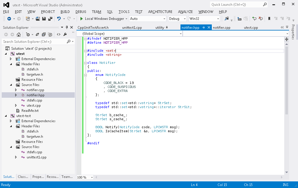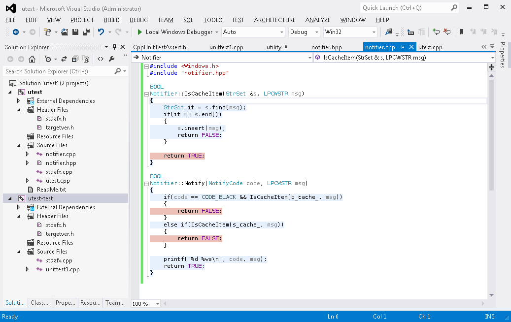 여기까지 마쳤으면 utest-test 단위 테스트 프로젝트에 테스트를 추가할 모든 준비가 끝났다. <리스트 5>에 나와 있는 것과 갈이 테스트 케이스를 추가해 보도록 하자. Assert::ArrEqual 함수는 n.Notify(Notifier::CODE_BLACK, L”BITEM”)의 실행 결과가 TRUE와 같은지 체크하는 기능을 한다. TRUE와 같으면 테스트가 성공하고, TRUE가 아닌 다른 값이 반환되면 테스트가 실패했음을 알려준다.