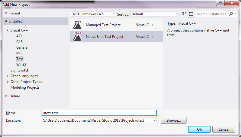 utest-test 프로젝트 설정 화면에 들어간 다음 C++ 탭의 General 페이지에 있는 Additional Include Directories 항목에 “..\utest”를 추가한다. 이 설정은 단위 테스트 프로젝트에서 utest 프로젝트에 포함된 헤더 파일을 바로 추가할 수 있도록 만들어 주는 기능을 한다.
