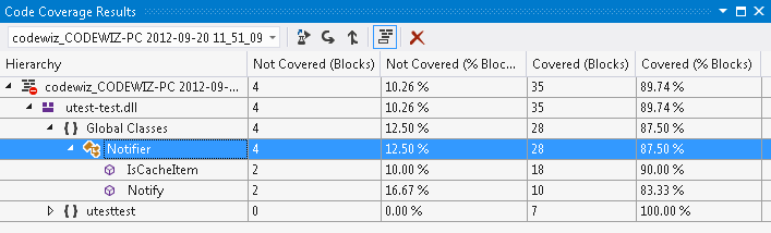 <화면 6>의 측정 결과를 살펴보면 우리가 작성한 테스트는 Notifier 클래스의 87.5%를 실행하고 있음을 알 수 있다. 세부적으로는 IsCacheItem 함수를 90%, Notify 함수를 83.33% 커버한다. 여기서 중요한 것은 어떤 부분이 테스트 되지 않았는지 살펴보는 것이다. IsCacheItem 함수 이름이 있는 줄을 더블 클릭하면 <화면 7>에 나타난 것과 갈이 실제 코드에서 테스트가 진행된 부분과 진행되지 않은 부분을 명확하게 나누어서 표시해준다. 붉은색으로 표시된 부분이 BlackNotifyTest를 통해서 테스트되지 않은 부분이다.