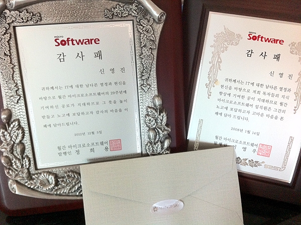 수욜날 마소 29주년 기념식이 있었습니다. 마소에서 감사하게도 별로 한 것도 없는 저에게 감사패를 주셨습니다. 100만 정기구독자로 보답하도록 하겠습니닷 ㅋ~ 물론 이게 끝이 아닙니다. 무려 명함 뽑기에서 상품권을 득템하는 행운까지~ 헐 ㅋ~ 네 맞습니다. 이상 자랑질이었습니다…