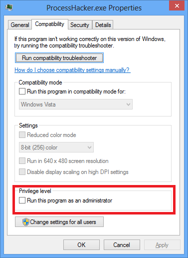 윈도우8에 많은 것들이 변경됐습니다. 그 중에 하나가 UAC 정책입니다. 예전에 UAC를 끄면 UAC가 없는 것과 동일했는데 윈도우8 그게 변경됐습니다. 아예 없는 것이 아니라 관리자 권한 요구가 매니페스트에 포함된 프로그램에게는 사라지는 것과 동일한데 그렇지 않은 프로그램의 경우 UAC를 꺼도 그 프로그램은 일반 권한으로 실행됩니다. 프로그래밍이나 테스트 작업을 하는 사람에게는 조금 불편합니다. 완전히 꺼버리는 방법도 있는데 보안상 그닥 권해 드리고 싶지 않습니다. 관리자 권한으로 자주 사용하는 프로그램의 등록 정보에서 아래 항목을 체크하면 그 프로그램만 관리자 권한으로 실행할 수 있습니다.